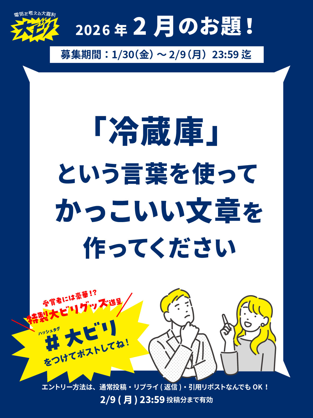 ・応募者のXアカウントにて、各月間の応募期間内にハッシュタグ「#大ビリ」を記入の上、テキスト等でXへ新規に投稿された作品が対象です。